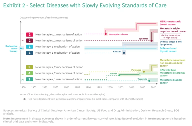 In our research, we studied the evolution of outcome improvements across ten diverse oncological diseases spanning a wide spectrum in terms of the number of clinical trials conducted, overall survival rate, and patient population size. In the case of some diseases, we observed a dramatic acceleration of change in the SoC, while in others the change has been much slower. (See Exhibits 1 and 2.) For any given disease, various factors can influence the pace of change in the SoC. We found that four of the most important are survival rate, the treatable population size, the level of understanding of the disease, and clinical-trial intensity.