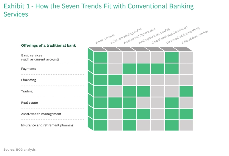The trends described in this report are all emerging. Banks have the opportunity not just to offer products and services, but also to define parameters related to them. For example, as a response to concerns about climate change and carbon emissions, banks can join the movement toward more energy-efficient crypto generation protocols.