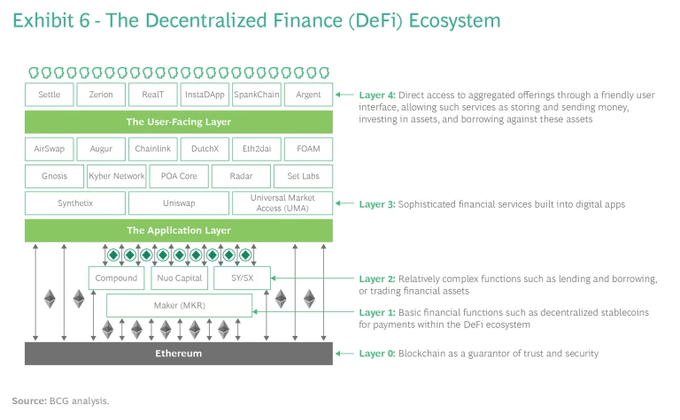 The DeFi business ecosystem consists of multiple layers of activity, each of which has attracted offerings from many companies. (See Exhibit 6.) Some of these companies have become known as market leaders. Among them are Uniswap, Compound, and MakerDAO, all based on the Ethereum platform but focused, respectively, on trading tokens, lending and borrowing, and managing currency.