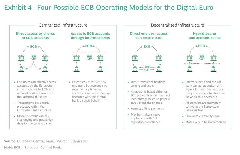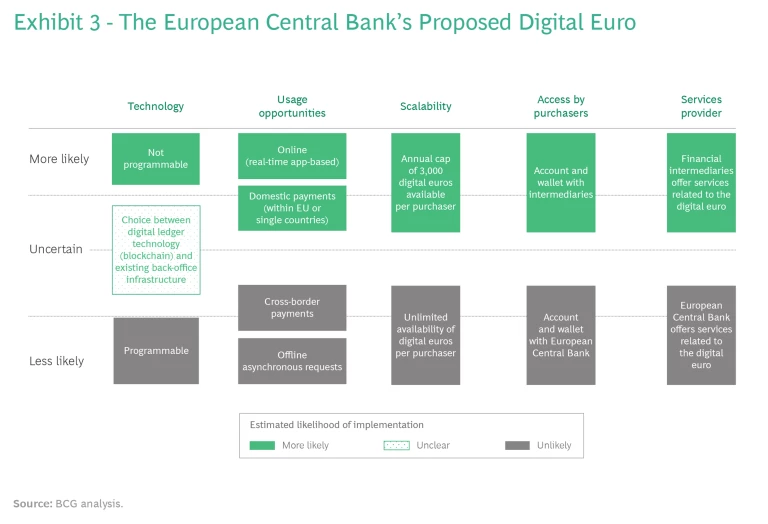 In July 2021, the European Central Bank (ECB) announced that it is undertaking a digital euro project, in which it will devote at least another two years to investigating alternative designs. For example, there may be privacy-related restrictions, or limits on the type of services offered, and specifications for low carbon release from the associated data-mining processes. Several possibilities are currently under consideration for the design of the digital euro, announced in July 2021 by the ECB as a project under investigation. (See Exhibit 3.)