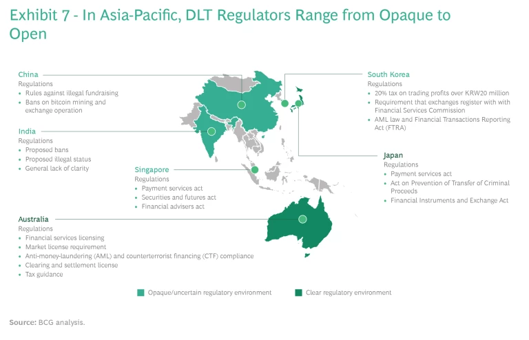On every continent, cryptocurrency work is increasing in range and intensity, for fintech in general and for digital ledgers in particular. Currently, the Asia-Pacific region remains at the forefront of experimentation and activity. Six countries have been particularly active: China, Japan, South Korea, Singapore, India, and Australia. Because of their support for DLT innovation, these countries are also role models for Europe and the US. (See Exhibit 7.)