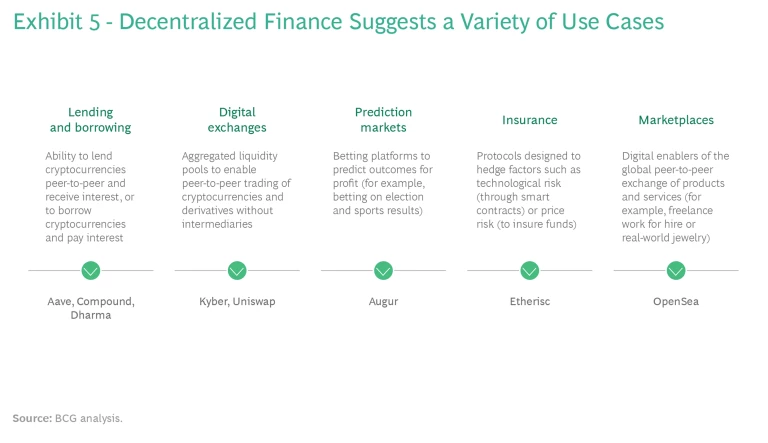 Many current use cases for DeFi involve pooling or dividing investments in innovative ways. (See Exhibit 5.) For example, liquidity pools combine several investment funds in one smart contract, all sharing a single blockchain. This permits liquidity mining (algorithmic distribution of new tokens to users) and tranching (division of financial products into risk categories). DeFi also enables small-scale businesses or individuals to stake transactions (a process similar to currency mining in its use of computer time to verify activity) or to hedge against risks (for example, by rapidly moving financial assets among protocols or pools, a process called yield farming).