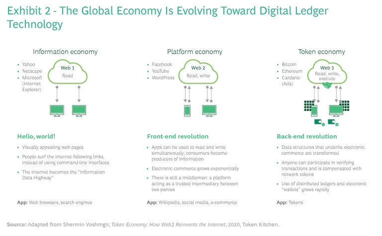 Because of its roots in cryptocurrency, DLT may be controversial in some quarters. But cryptocurrency is only one part of the DLT story. The digital ledger is so pragmatic and utilitarian in its own right that it may ultimately be taken for granted as a cornerstone of the banking industry. Indeed, some observers argue that the digital ledger marks a third great wave of internet-based technology. (See Exhibit 2.) This “token economy,” as the World Economic Forum calls it, originated with the internet and its free exchange of information, but then progressed to platforms, which offer more functionality and control, and now to tokens—data structures that can reliably execute transactions without human oversight.