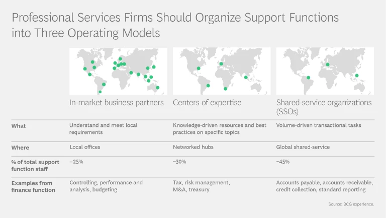 To capture the benefits of digitization, professional services firms must first simplify and standardize the operating model for their support functions. The ideal operating model optimizes allocation of support function resources across three types of roles.