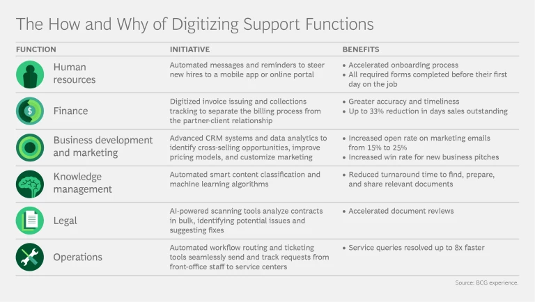 To digitize their support functions, professional services firms can take three mutually reinforcing actions.