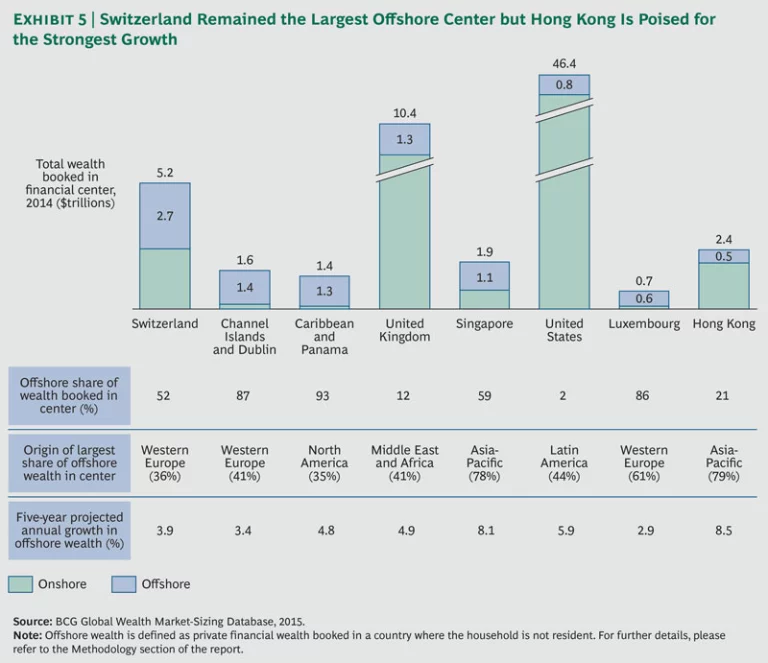 Outlook for Offshore Booking Centers. Switzerland remained the leading offshore booking center in 2014, with $2.7 trillion in wealth from abroad, or 25 percent of total offshore bookings globally. (See Exhibit 5.) The country remains under intense pressure, however, from both European and U.S. tax authorities seeking to crack down on tax evasion.
