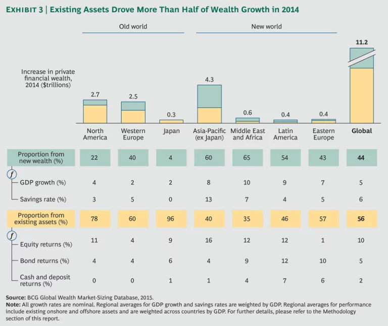 Globally, more than half ($6 trillion, or 56 percent) of private wealth growth in 2014 was generated by the market performance of existing assets, with the balance ($5 trillion, or 44 percent) generated by newly created wealth. (See Exhibit 3.) Asia-Pacific (excluding Japan), the MEA region, Latin America, and North America saw significant rises in equities, while Eastern Europe and Latin America experienced double-digit growth in bonds. Extraordinary market gains were seen in China and India, driven mainly by investments in local equities.