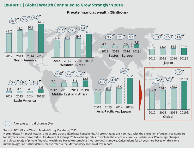 Over the next five years, total private wealth globally is projected to post a compound annual growth rate (CAGR) of 6 percent to reach an estimated $210 trillion in 2019.