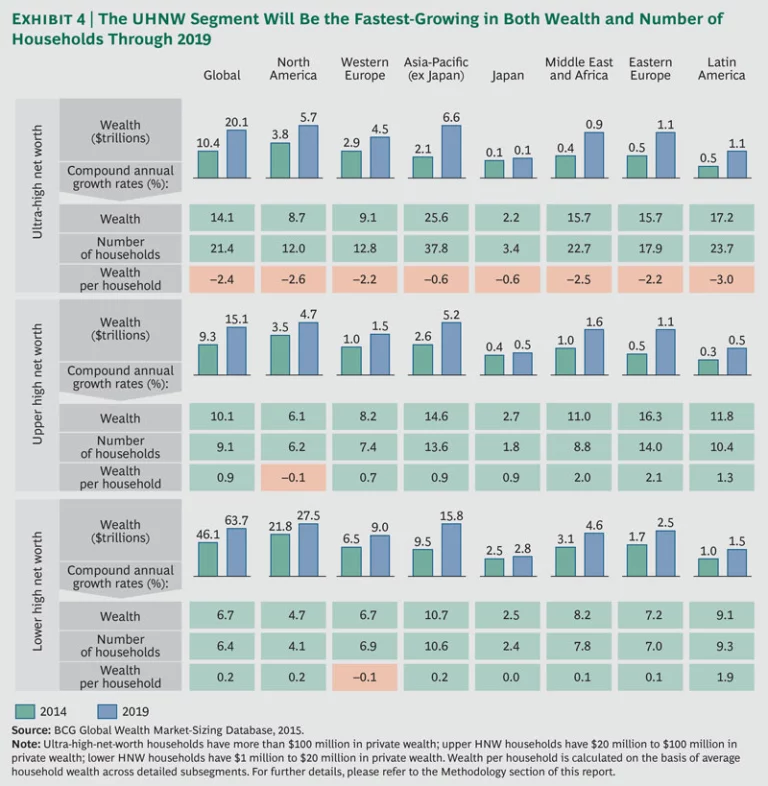 Private wealth held by the upper high-net-worth (HNW) segment (those with between $20 million and $100 million) rose by a healthy 23 percent in 2014 to more than $9 trillion. With a projected CAGR of 10 percent over the next five years, this segment is expected to surpass $15 trillion in private wealth in 2019. This growth will be triggered by both a large number of new households entering the segment (a projected CAGR of 9 percent) and growth in average wealth per household (a CAGR of 1 percent).