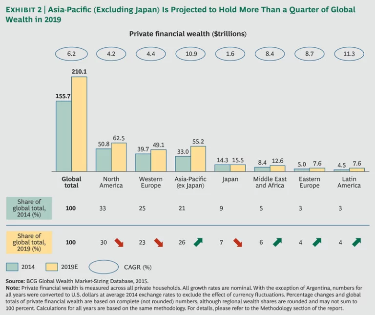 North America, with $51 trillion in private wealth, remained the world’s wealthiest region in 2014. Western Europe, with $40 trillion, maintained its status as the second-wealthiest region, with Asia-Pacific (excluding Japan) in third place at $33 trillion. With a projected $55 trillion in 2019, Asia-Pacific (excluding Japan) is expected to surpass Western Europe (a projected $49 trillion) and to close in on North America (a projected $62 trillion). The share of global financial wealth held in Asia-Pacific (excluding Japan) is projected to increase from 21 percent in 2014 to 26 percent in 2019. (See Exhibit 2.)