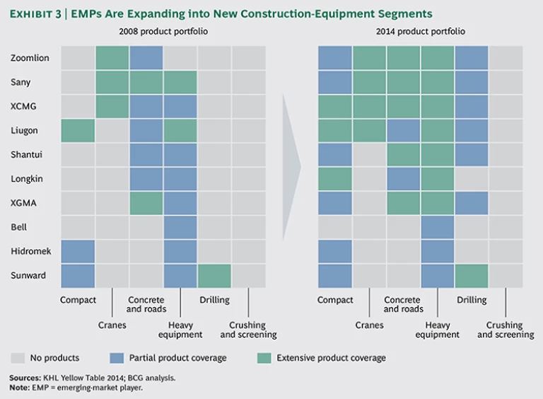 Products and Technology. The executives we interviewed cited increasing innovation as a top priority. EMPs have already significantly enhanced their product portfolios over the last half decade or so. (See Exhibit 3.) They should continue to invest aggressively to further close the gap in terms of performance and quality. EMPs particularly need to catch up in engine technology and make sure that they can fully comply with Western emission standards if they wish to stay in the game and expand their global reach. The U.S. norms for hydrocarbon and nitrogen oxide emissions, for example, are 0.6 grams per kilowatt-hour in the 130 to 560 kw engine class, which is more than ten times stricter than the standards in China. It is no surprise that Chinese players are only just beginning to offer compliant products.