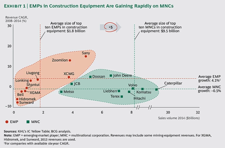 Despite the headwinds at home, however, the largest EMPs—Zoomlion and Sany of China—have now reached about $5 billion in annual revenues, making them bigger than such longtime incumbents as Metso and JCB. (See Exhibit 1.) The top Chinese players have continued to expand their foreign-market forays, which they had initiated late in the previous decade.