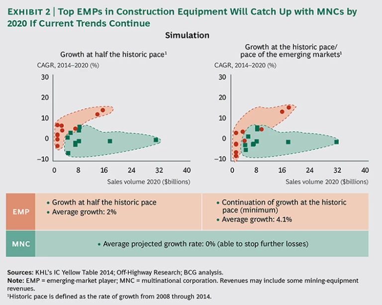 Top industry executives interviewed by BCG believe that, in the short term, the construction equipment business will see a bit of a slowdown in the further expansion of EMPs. In particular, Chinese companies have recently curtailed their expansion plans as they wrestle with slower growth at home. After they restructure, however, challengers from China are expected to renew their attack on the home markets of MNCs. According to our simulations, the top construction-equipment EMPs will catch up with the top MNCs in size by 2020 if they continue to grow at the same rate. (See Exhibit 2.) In four years or so, three of the world’s five largest construction-equipment manufacturers could be based in emerging markets if these companies continue to grow at their current rates. Also, if China gets serious about its goal of consolidating some industries, executives say a Chinese construction-equipment giant could begin approaching the size of Caterpillar and Komatsu, the current global leaders.