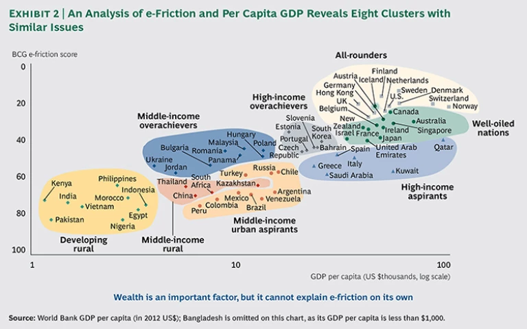 Wealth is a cause, not a determinant, however. For countries with any given level of GDP, e-friction can vary significantly. Qatar has the highest per capita GDP in the world ($146,000) according to the International Monetary Fund, yet it ranks twenty-third on the BCG e-Friction Index with a score of 40. Finland, twenty-fifth with a per capita GDP of $40,000, ranks number two in e-friction with a score of 17.