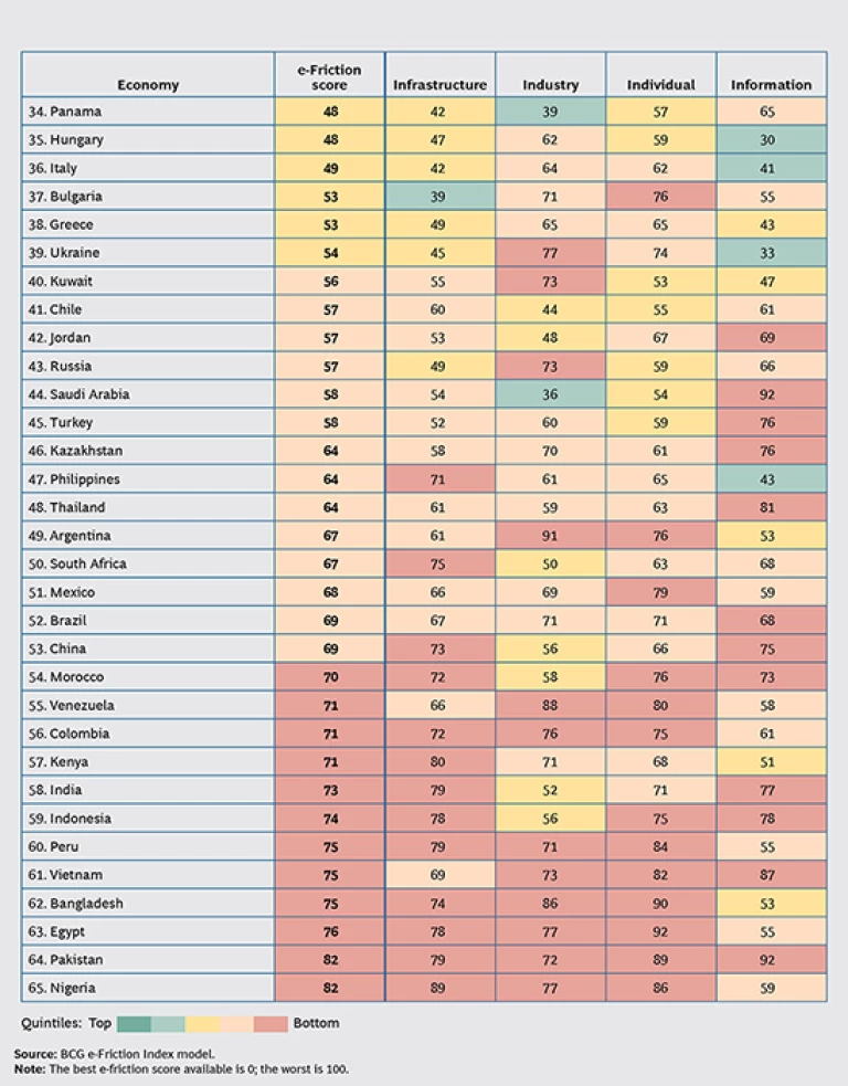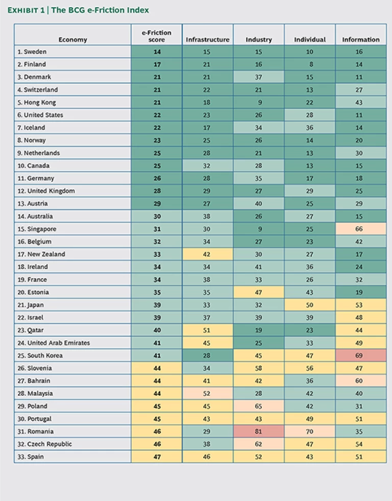 The Boston Consulting Group’s e-Friction Index ranks economies according to four types of friction: infrastructure, industry, individual, and information. (See Exhibit 1.) Infrastructure-related friction, which limits basic access to online activity, is the most significant and accounts for one-half of an economy's total e-friction score. The other three components are equally weighted. Industry-related sources of friction, such as shortages of capital and skilled labor, hold back successful online-business operations and the development of digital businesses. Individual friction—payment systems and data security are two examples—affects the degree to which citizens and consumers engage in online activities. Information-related friction includes the volume of content available in a local language, a country’s commitment to Internet openness, and the obstacles to accessing certain types of content.