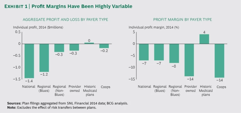 Payers that have been pricing below cost on the exchange, relying on government programs to cover their losses, will be forced to either increase prices on a highly price-sensitive customer base (especially for subsidized consumers) or exit the market. Plans that made significant bets on the exchange (and off exchange) will need to reexamine the merits of those choices. With widely varying profitability and no clear winning strategy, even profitable plans have taken on sizeable regulatory risk and considerable expense, in both their investment dollars and company resources. (See Exhibit 1.) Even if pricing and margins stabilize in the individual segment (and assuming there’s no large-scale employer dumping, which we don’t expect), total profit pools will reach just $2 billion, a small fraction of the profits generated by other segments.