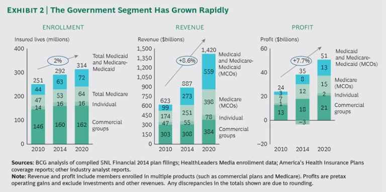 The government segment will grow, but margin compression is a threat. The government segment has grown rapidly, and is expected to continue growing at a compound annual rate of 5% through 2020; enrollment in Medicare and Medicaid is expected to increase steadily through 2020, generating billions in revenue and profit. (See Exhibit 2.) But the segment’s future is closely tied to the Centers for Medicare & Medicaid Services, a federal agency that is susceptible to enormous fluctuations in response to the political climate and changing regulations. The recent cuts in Medicare Advantage funding and increased oversight of rate setting for Medicaid are just two examples.