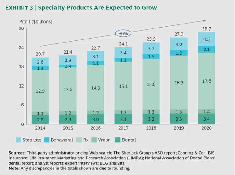 Specialty segments are becoming a core capability. Business segments that were formerly considered adjacent or add-ons are becoming a core profit pool. Specialty services, such as dental, vision, and behavioral health, will continue to grow. (See Exhibit 3.) This is yet another reason why the commercial segment remains highly attractive: there is a significant growth opportunity in these adjacent areas. To fully maximize the ESI group opportunity and seize share in the specialty segment, health plans need to rethink their core capabilities. As more employers move to self-insurance, a payer’s ability to supplement lower ASO profits with add-on products will dictate its success in ESI. Payers may need to revisit prior decisions to outsource specialty services to third parties and instead bring these capabilities back in-house.