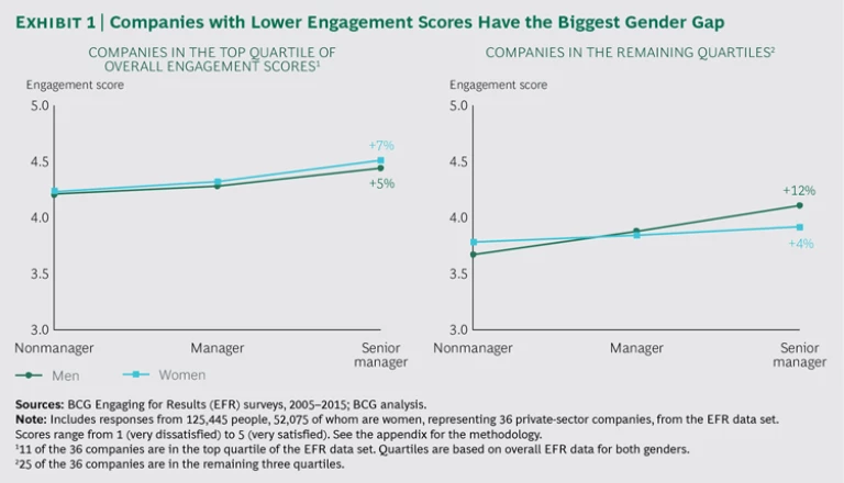 Among both men and women, engagement typically increases with rising seniority. As people take on greater responsibility and have more direct interaction with the C-suite, they tend to become more engaged. Our data shows that companies with the highest overall engagement scores (those in the top quartile)