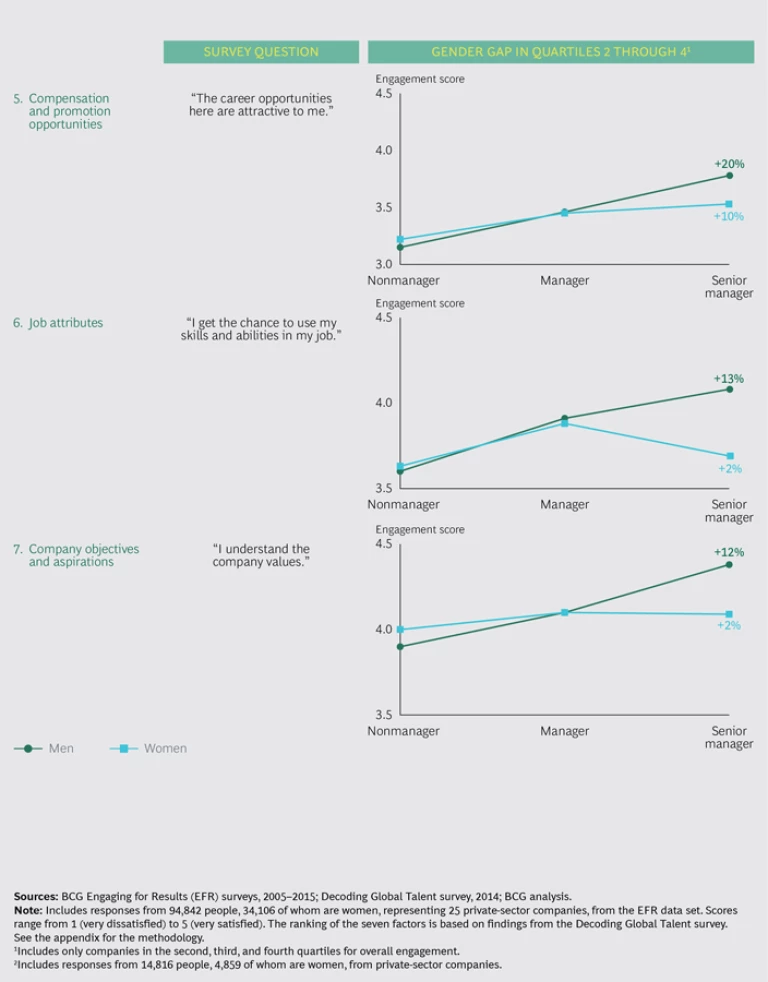 2. Work-Life Balance. Work-life balance or flexibility is the second-most-important factor for both women and men. As men rise in seniority, they report more support from their colleagues for their nonwork obligations, while women report the opposite. To look more closely at this discrepancy, we partnered with InHerSight, a US-based website that solicits ratings from employees about their employers. The data is clear: even the best programs will not improve engagement if they don’t offer what employees want. Flexible working hours and paid time off rate relatively high (roughly 3.1 out of 5); other work-life-balance programs—such as maternity and adoptive leave, family growth support, and wellness initiatives—rate lower (roughly 2.6). This data is US-focused, but BCG’s global data points to similar conclusions: companies seeking to improve employees’ work-life balance can do better. As always, the devil is in the details. Even the best programs will not improve engagement if companies don’t get the implementation right.