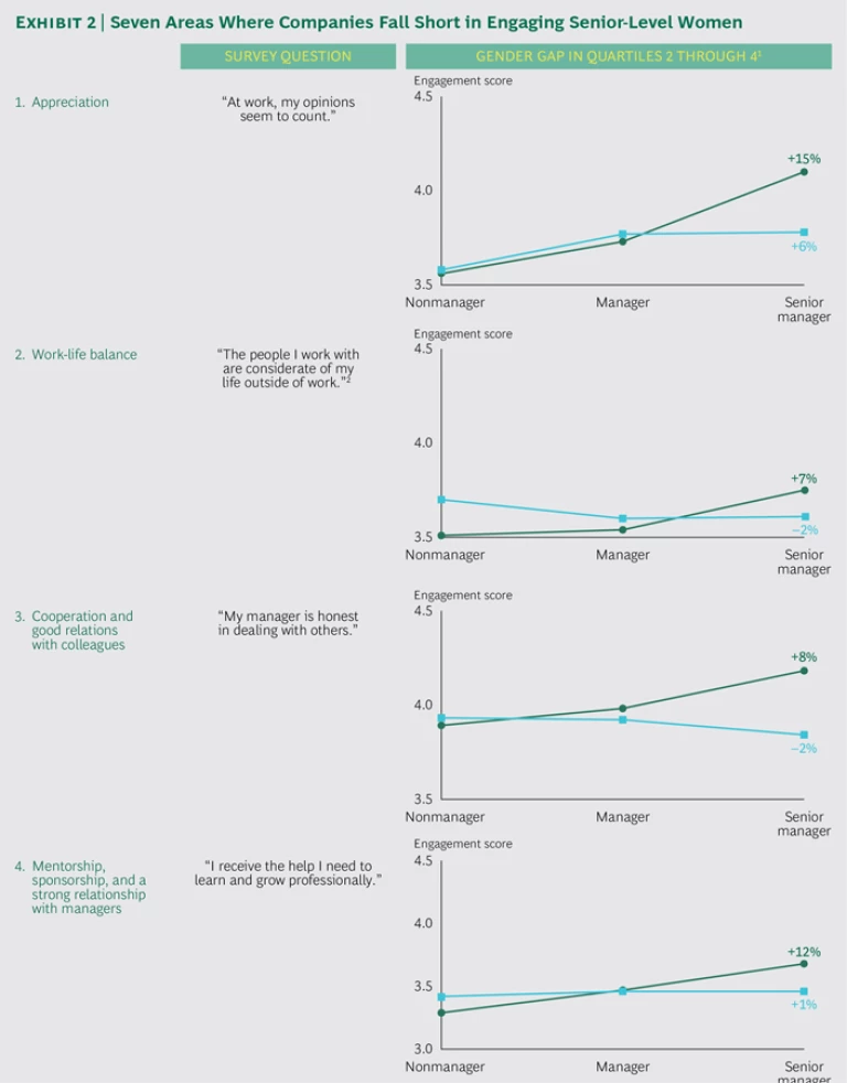 1. Appreciation. Women cite appreciation for their work from their superiors as the top criterion they look for in a job—as do men. In lower-engagement companies, senior women report feeling less appreciated. On questions concerning whether their opinions count and whether managers recognize and comment when they do good work, senior women’s scores are considerably lower than those of their male peers.