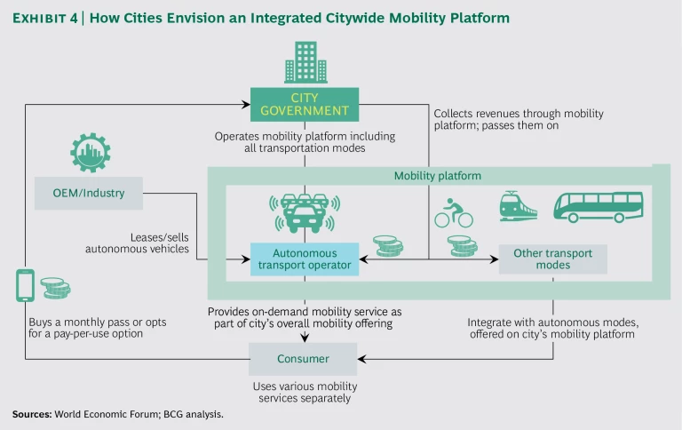 A digital mobility platform that aggregates all transportation modes should be at the heart of the new urban mobility ecosystem. In the 2016 BCG report cited above, we discussed the importance of having an integrated mobility platform to help a city manage traffic volume and flows while at the same time offering consumers a single easy-to-use point of access to the city’s transportation network. Boston envisions just such a platform, which consumers will be able to use to plan and book trips, accessing it through a device such as a smartphone and receiving real-time information about delays and transportation alternatives. The system will manage payments centrally. (See Exhibit 4.)
