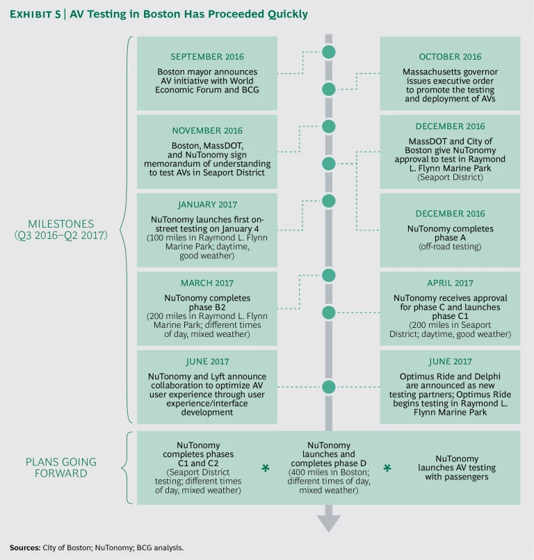 In 2016, Boston quickly adopted several measures to drive AV development forward: the launch of its initiative with the World Economic Forum and BCG; an executive order from Mayor Martin Walsh establishing AVs as a priority and naming Gina Fiandaca, the commissioner of Boston’s Department of Transportation, to lead the city’s AV effort; and a memorandum of understanding with NuTonomy and the Massachusetts Depart-ment of Transportation (MassDOT) that confirmed their joint commitment to begin on-street testing and defined the scope of the tests.