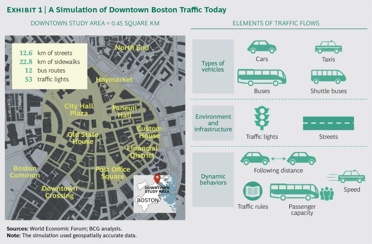 Among the many benefits that AVs promise, the most tangible may be reduced congestion and improved traffic flows. To quantify these benefits, BCG, the World Economic Forum, officials from the City of Boston, and MIT Media Lab developed an agent-based traffic simulation model. Our model looked at a 0.45-square-kilometer area in Boston’s downtown core—a historic and bustling district near City Hall. We modeled current city traffic flows over a typical 24-hour period using real-life geographical and trip data for the area, including trip origin and destination pairs. (See Exhibit 1.) Simulated vehicle behavior included such realistic elements as stops at traffic lights, left turns, typical vehicle-following distances, and even instances of bad driving of the sort that cause random street blockages. (See the Appendix for more about our model and assumptions.)