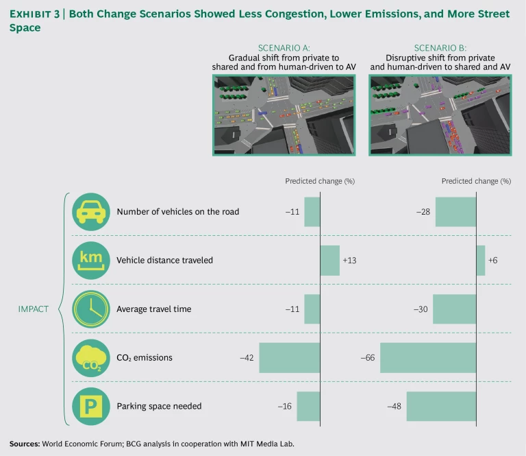 In terms of traffic flow, both simulations yielded less congestion and shorter travel times. (See Exhibit 3.) In the evolutionary scenario, the number of vehicles in the study area fell by 11% (largely as a result of more car sharing and ride sharing). Travel time dropped by an average of 11%. In the revolutionary scenario, the number of vehicles in the area fell by 28%, and average travel time declined by 30%.
