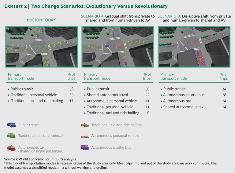 We then created two scenarios based on a vehicle mix in which shared AVs replaced a substantial percentage of the traditional private vehicles (and, to some extent, public-transit trips) included in the current traffic flow model. (See Exhibit 2.)
