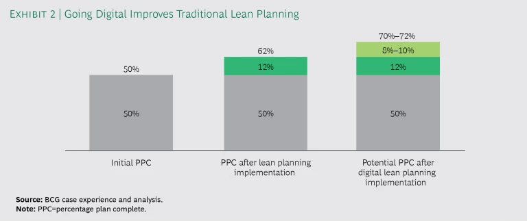 Several digital applications already exist that include some lean planning functionalities, such as providing detailed Gantt charts, and supporting design and document collaboration. (See “Shaping the Future of Construction: Inspiring Innovators to Redefine the Industry,” BCG article, March 2017.) This functionality is a good start, but it is not enough to fully support the lean planning process. Ultimately, digital can boost lean benefits and increase PPC. (See Exhibit 2.)