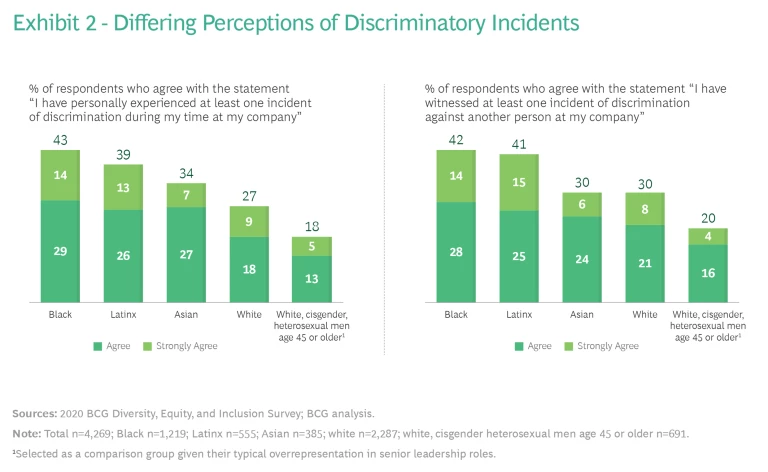 Specifically, relative to white employees, significantly more Black and Latinx employees surveyed report experiencing at least one incident of discrimination and witnessing at least one such incident while at their current company. (See Exhibit 2.)
