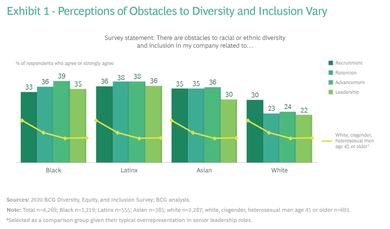Employees in racially and ethnically underrepresented groups in our survey saw more obstacles related to retention and advancement than to recruitment. This finding suggests that leaders should ask themselves not only whether they have hired a diverse team but also whether they have created an equitable and inclusive environment for underrepresented groups.