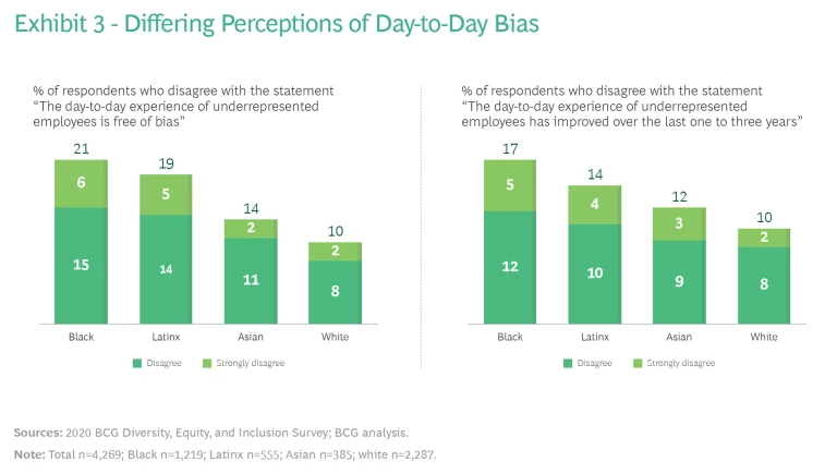 Fifty-six percent of white respondents report that their workplace is free of day-to-day bias. But a sizeable proportion of the racially or ethnically underrepresented groups (roughly twice as many Black and Latinx respondents as white respondents) disagreed or strongly disagreed. Perhaps of even greater concern, many employees do not feel that their companies have made progress on this front over the past one to three years. (See Exhibit 3.)