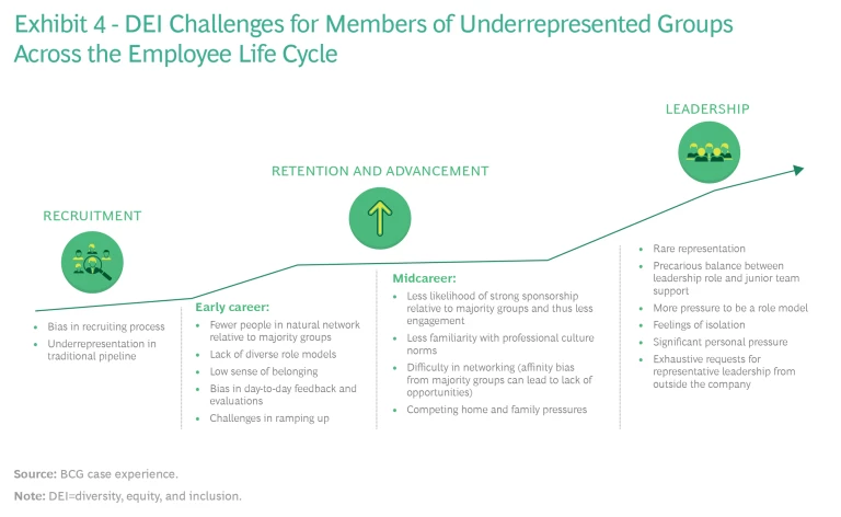 Exhibit 4 shows a (non-exhaustive) view of the challenges we often see at various stages in the employee life cycle for racially or ethnically underrepresented groups.