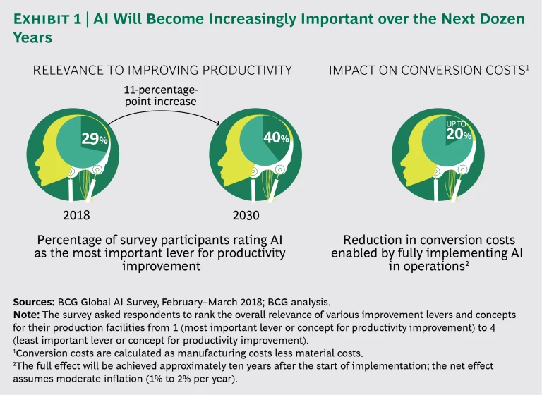 Our study demonstrates that AI is on the verge of becoming the most important lever for enhancing operational productivity. But many companies have failed to recognize that capturing the benefits of AI requires more than investing in technology. A clearly articulated strategy is an essential starting point—but even that is not sufficient. A company must put appropriate governance and supporting infrastructure in place, and it must reconfigure and retrain its workforce. Producers that have not yet adopted a holistic perspective on AI implementation should quickly raise their game in order to catch up to early adopters.