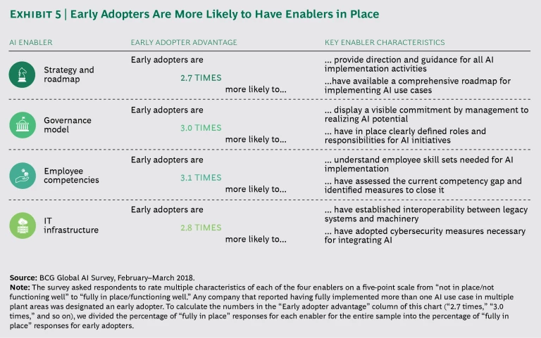 Four enablers are critical to the successful implementation of AI in operations: strategy and roadmap, governance model, employee competencies, and IT infrastructure. Early adopters have made significantly greater progress than laggard companies have toward making the AI enablers fully functional. (See Exhibit 5.)