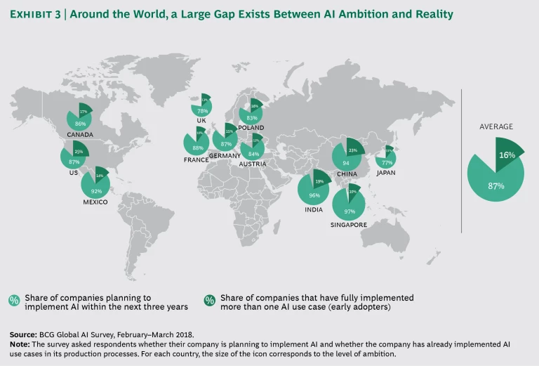 The survey revealed that transportation and logistics, automotive, and technology companies are at the forefront of AI adoption, while process industries (such as chemicals) lag behind. Companies in the US, China, and India have taken an impressive lead in adoption over their counterparts in such countries as Japan, France, and Germany. The differences in speed of AI adoption across countries reflect different expectations regarding AI’s benefits.