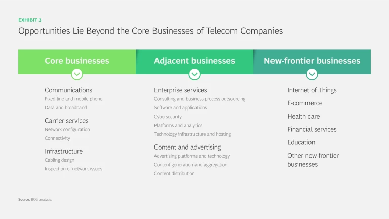 Although adjacencies are natural extensions of a telco’s business, new frontiers can take operators quite far from the core. These areas include solutions focused on specific industries, such as health care or education, as well as the Internet of Things (IoT). (See Exhibit 3.) Within the telecom industry, these areas have generated a fair measure of excitement. But as telcos move further from their comfort zone, they should proceed with caution—and a well-crafted strategy.