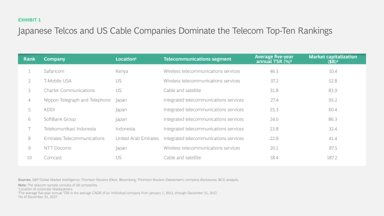 Within the top ten, Japanese telcos have four spots, and US cable companies have two. (See Exhibit 1.) In a way, this isn’t surprising: Japanese operators have benefited from a relatively favorable regulatory environment, as reflected by their expanding valuation multiples. And as a technology, cable is still highly competitive. As in our previous report, most of the top ten positions are occupied by operators in mature markets, which by now have reached penetration rates that aren’t likely to go much higher. Signing up new subscribers and paying dividends have historically been value drivers, but top performers are also seeking other value-creation opportunities. This willingness to shake up the business helps to explain why emerging market players have not been outperformers. In these markets, subscriber growth has waned as well, but operators have been slow to transform. Meanwhile, the entry of radical players with disruptive business models, such as Reliance Jio Infocomm in India, has exacerbated the challenge for incumbent players.