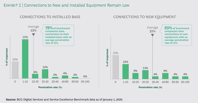 Among companies in the 2020 survey, 78% have connections of some kind with their installed base of equipment. (See Exhibit 2.) However, the average penetration rate is just 13%.