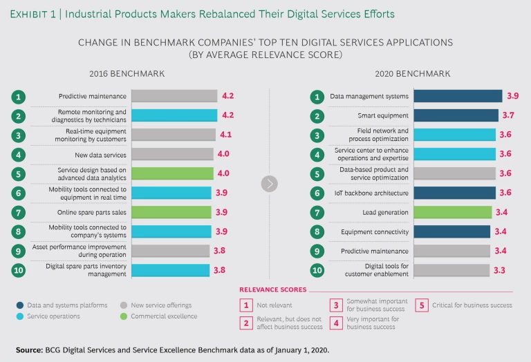 The realization led industrial products makers to rebalance their efforts to focus on establishing the core data platforms and systems that serve as the underpinnings of other digital services. The adjustment they made is clear from BCG’s ongoing benchmarking survey of industrial products makers’ digital services strategies. In 2016, these “enabler” technologies had yet to appear on anyone’s radar. In 2020, they account for four of the participating companies’ top ten priorities.