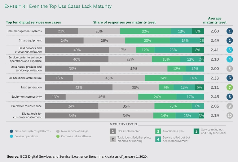 Even so, work on enabler technologies has progressed faster than work on the other digital services identified as top use cases. That makes sense because companies can’t begin to offer those services until the foundational enabler technologies are in place. In the areas of predictive maintenance systems and customer enablement alone, nearly 70% of the benchmark companies have not implemented a pilot.