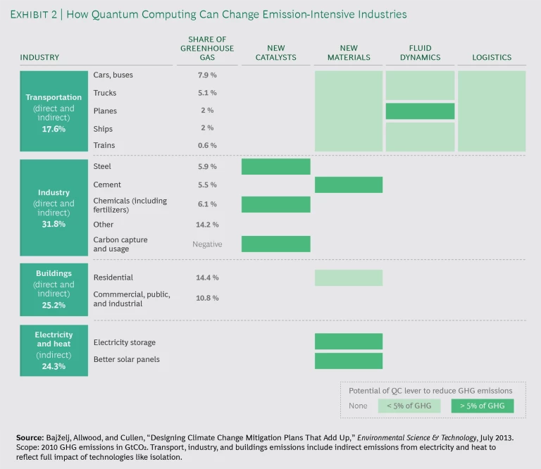 For example, if applied to current low-emission technologies, quantum computing could contribute to solutions that change how we generate and store power; how we build houses, cars, ships, and airplanes; how we power transportation; and even how we design long-standing industrial processes such as cement, steel, and fertilizer manufacturing. Add it all up and quantum computing–enabled technologies could one day address a majority of emissions.