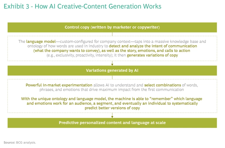 The AI-powered capability rapidly entering the mainstream—which we call AI creative-content generation—changes that with algorithms married to massive databases of tagged words and phrases. At each point of customer interaction, the technology strives to choose the words and phrases that will resonate most powerfully and to match the most effective combinations with their intended recipients. Automating both the content generation and the targeting of individual messages represents a step change in personalized marketing.