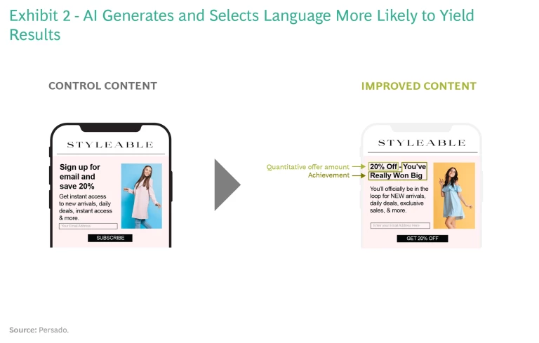For example, a large retailer was experiencing declining engagement with its pop-up web-advertising copy, leading to reduced acquisition of high-quality customers and reduced sales from new visitors. The problem was also compromising the company’s ability to derive the insights needed to create personalized messaging. Using Persado’s platform, the retailer achieved a 127% increase in revenue, a 112% uplift in orders, and 103% more new-shopper sign-ups. Moreover, it was able to confirm that the use of achievement-oriented language in its ads—"You’ve really won big”—was the single biggest driver of new subscribers. (See Exhibit 2.)