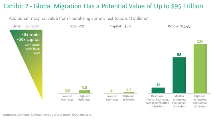 The estimated numbers are extraordinarily large. If, theoretically, all restrictions to labor mobility were removed, then the world could see an increase in global economic output of up to $95 trillion per