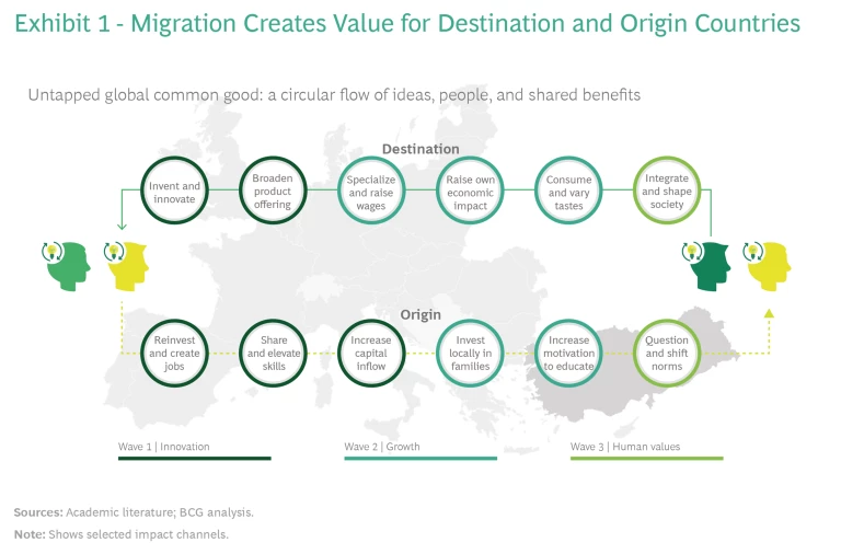 We explore the ripple effects of these impacts, wave by wave, in broad strokes, while keeping in mind that the reality and perception of global migration depend on context and are multifaceted. (See Exhibit 1.)