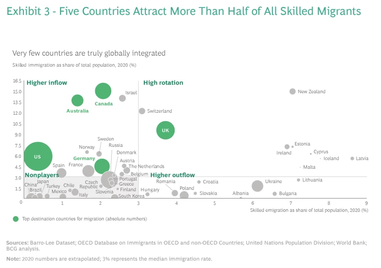 While global migration flows have the potential to generate circular benefits, it’s clear from these numbers that countries and companies start off facing vastly different conditions and a very unequal playing field. (See Exhibit 3.)