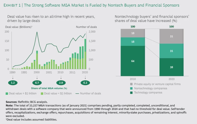 The M&A market for software companies has been booming. The cumulative value of software M&A deals soared to an all-time high in 2020 even as overall M&A activity decreased. And the volume of software deals has continued to grow, approaching the record level of the dot-com bubble. Nontechnology companies and financial sponsors are helping to fuel the hot market, as they increasingly join traditional technology players in pursuing software targets.